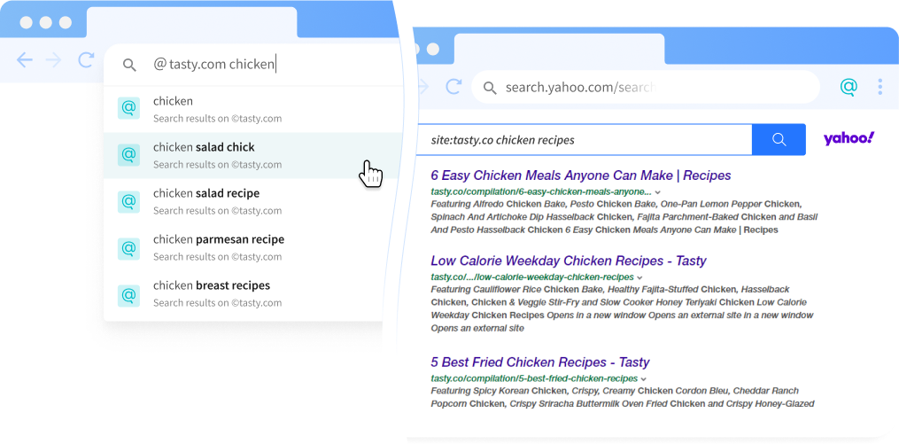 You can activate the quick commands in your browser's address bar, such as @techcrunch duel-screen, to activate the search on the content site without the need of going to the content site first.